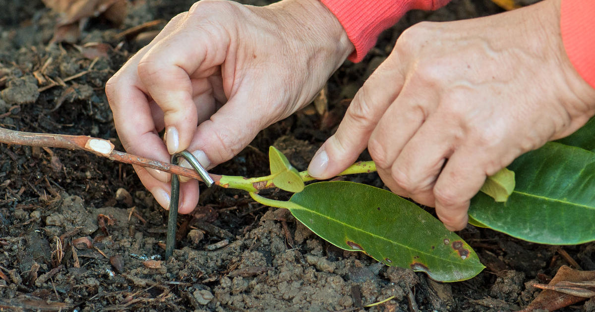 Bedecken Sie die Kontaktstelle gut mit Erde und halten Sie sie feucht. Optimal ist es, wenn Sie den Trieb so tief in der Erde festmachen, dass die Triebspitze danach senkrecht nach oben zeigt. Befestigen Sie die Triebspitze dann an einem Stab, denn sie wird die neue Pflanze werden. Wie lange es dauert, bis der Absenker Wurzeln treibt, variiert je nach Pflanzenart und Witterung. Manchmal dauert es nur wenige Wochen, manchmal müssen Sie sich bis zum nächsten Frühjahr gedulden.